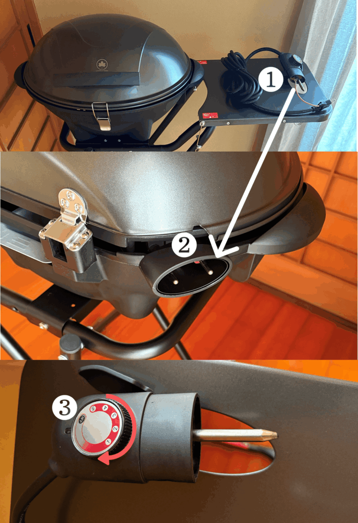 ※上の操作ダイヤルを右に回すと温度調節ができ、下の操作ダイヤルを回すと時間を設定できます。