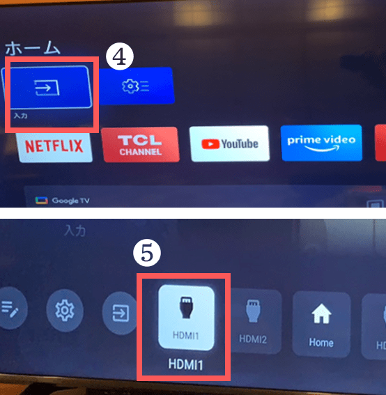 細いリモコンで「入力」を選択して、OKを押します - 細いリモコンの矢印ボタンで「HDMI1」を選択すると地上波チャンネルが映ります。